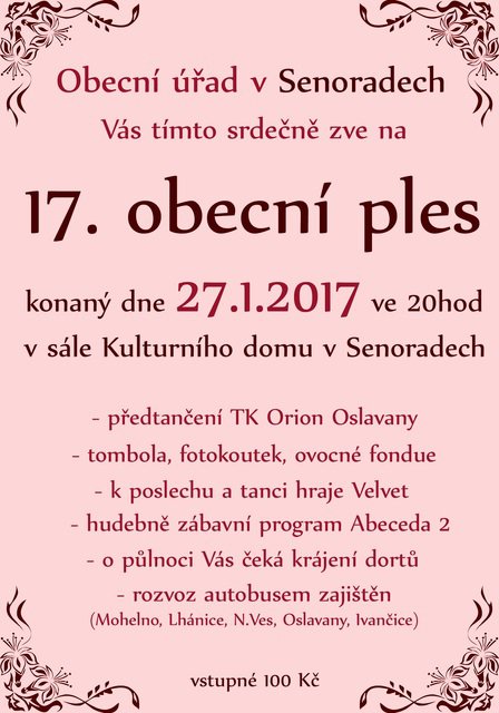 Obec Senorady si vás dovoluje srdečně pozvat na 17. obecní ples, který se uskuteční 27. ledna 2017 od 20:00 hod. v kulturním domě v Senoradech.
