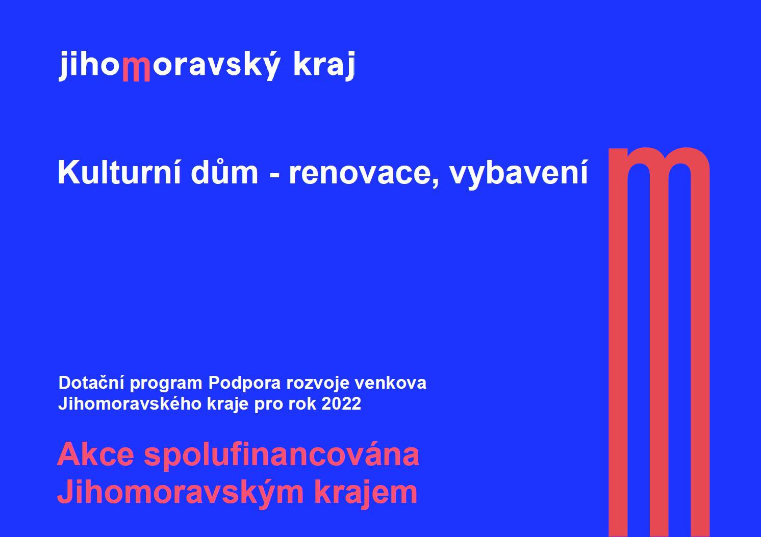 V roce 2022 obdržela naše obec dotaci z Jihomoravského kraje na renovaci a vybavení kulturního domu ve výši 81 000,-kč. Z dotace byla uhrazena část nákladů na pořízení nových vstupních dveří do kulturního domu. V přízemí byla instalována pojezdová oddělovací mříž a do celého kulturního domu byly pořízeny úsporné LED trubice.