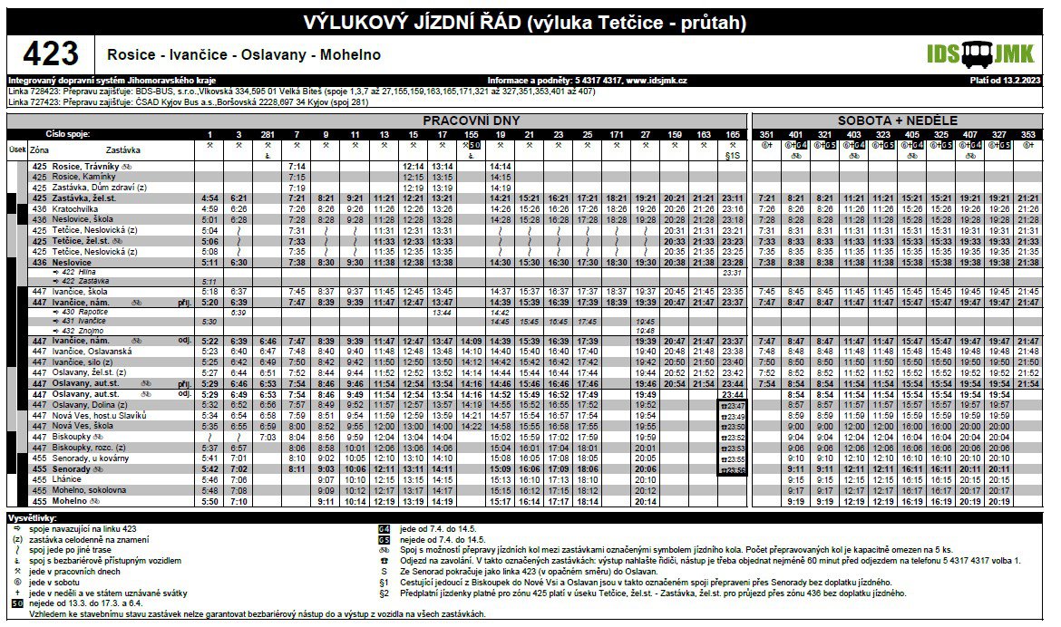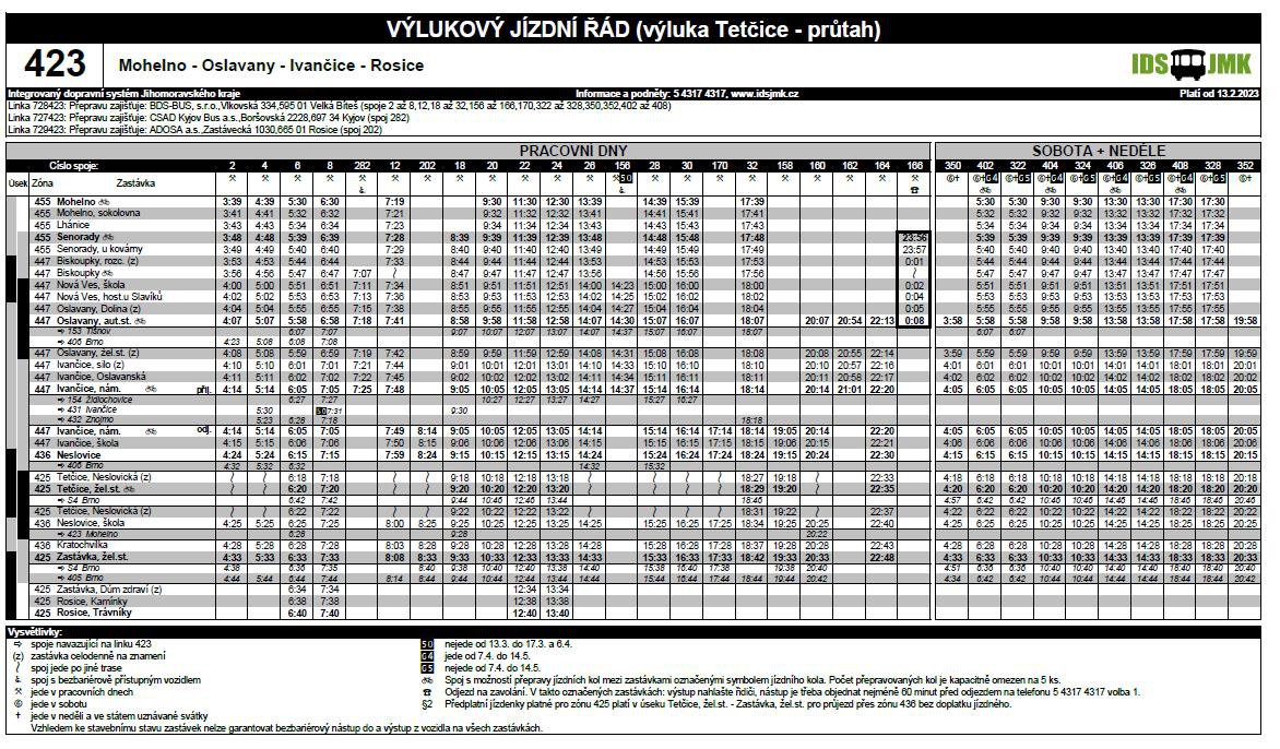 Linka 423 jede z Neslovic odklonem přes Kratochvilku do Zastávky, žel.st. Vybrané spoje jsou prodlouženy do Rosic. Vybrané spoje jedou závlekem z Neslovic do Tetčic.