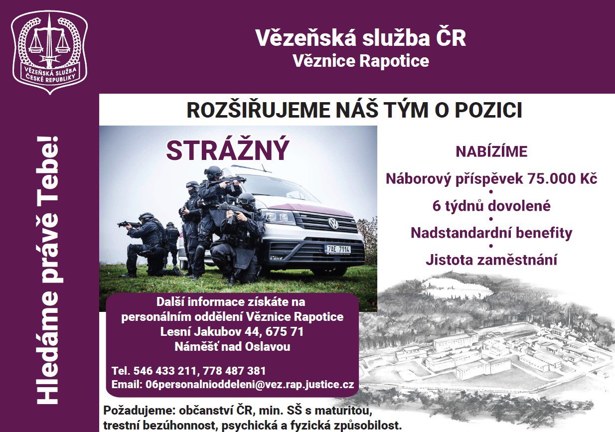 V přílohách zveřejňujeme nabídku pracovní pozice - strážný - Věznice Rapotice