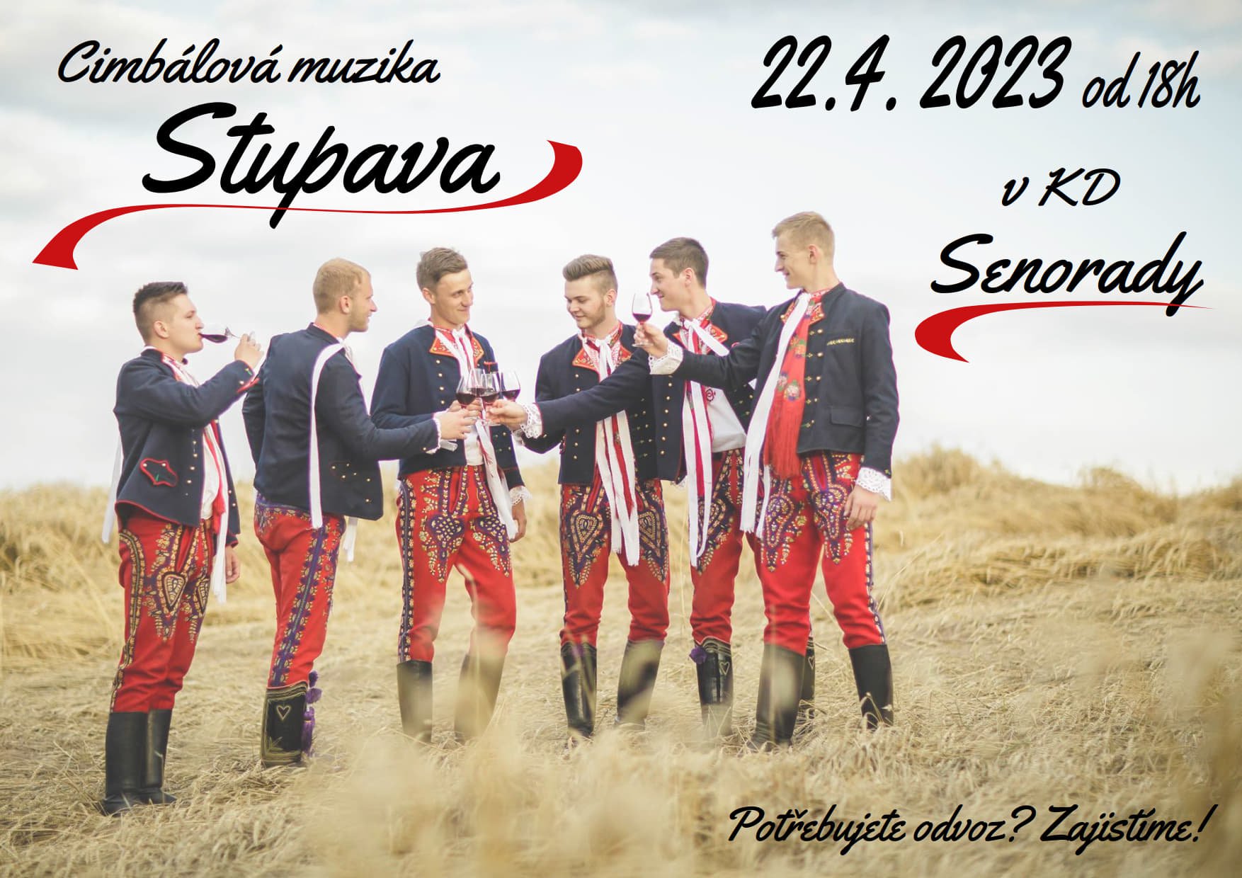 Srdečně zveme všechny příznivce dobré zábavy, jídla a pití na jarní posezení s Cimbálovou muzikou Stupava. Akce se koná v sobotu 22.4.2023 od 18:00 hodin v kulturním domě v Senoradech. Vstupné 150,-kč.
