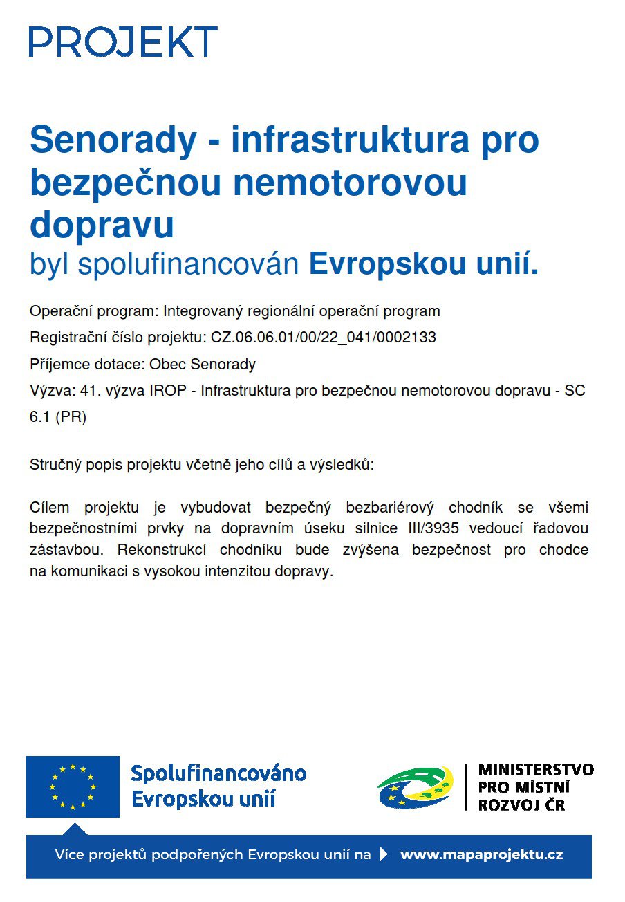 Celý projekt s názvem Senorady-infrastruktura pro bezpečnou nemotorovou dopravu zahrnuje rekonstrukci a stavební úpravy komunikací pro pěší v dané lokalitě.