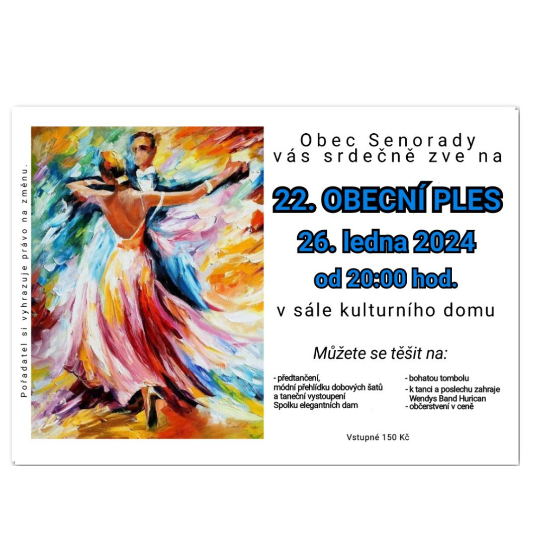 Vážení příznivci dobré zábavy a společného setkávání, srdečně Vás zveme na 22. Obecní ples v Senoradech, který se koná 26.ledna 2024 od 20:00 hodin. Můžete se těšit na chutné občerstvení, bohatou tombolu i doprovodný program. Těšíme se na Vás!