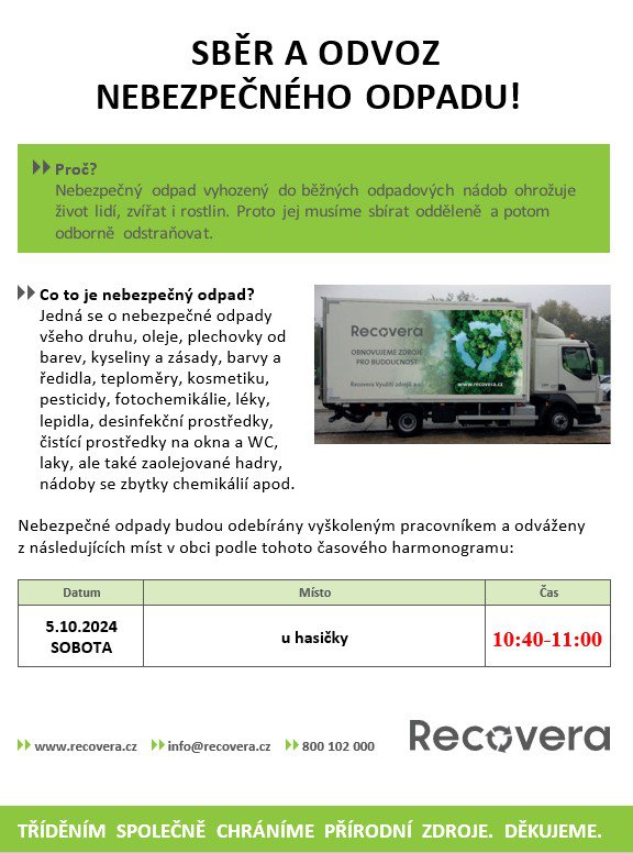 Oznamujeme občanům, že svoz nebezpečného odpadu proběhne v sobotu 5.10.2024 v čase 10:40 - 11:00 hodin od hasičské zbrojnice.