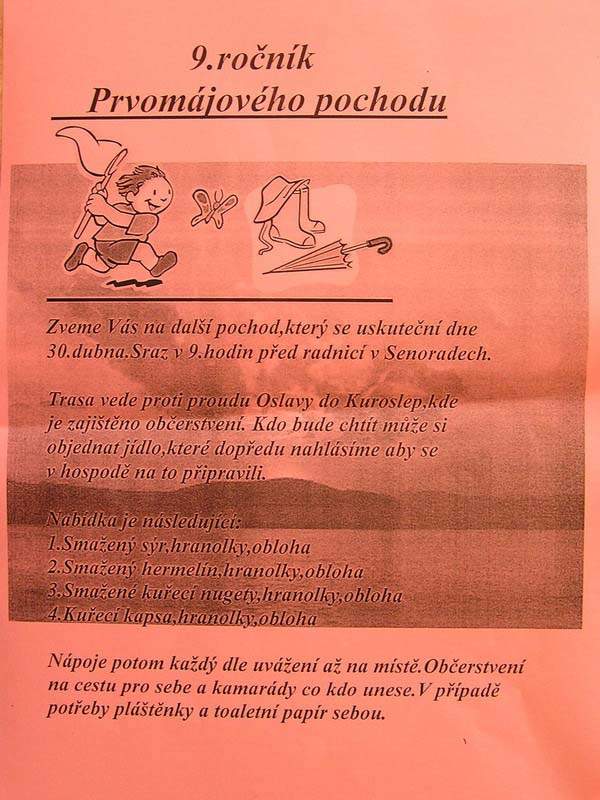 Dne 30. dubna se uskuteční prvomájový pochod do Kuroslep údolím řeky Oslavy. Sraz je v 9hod před kulturním domem Senorady. Je možné si dopředu objednat jídlo v hospodě, více viz. letáček.