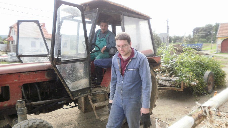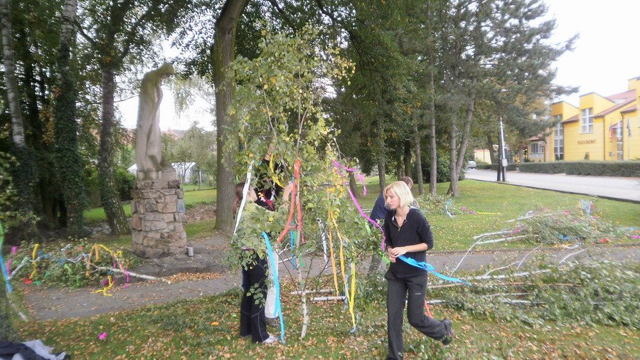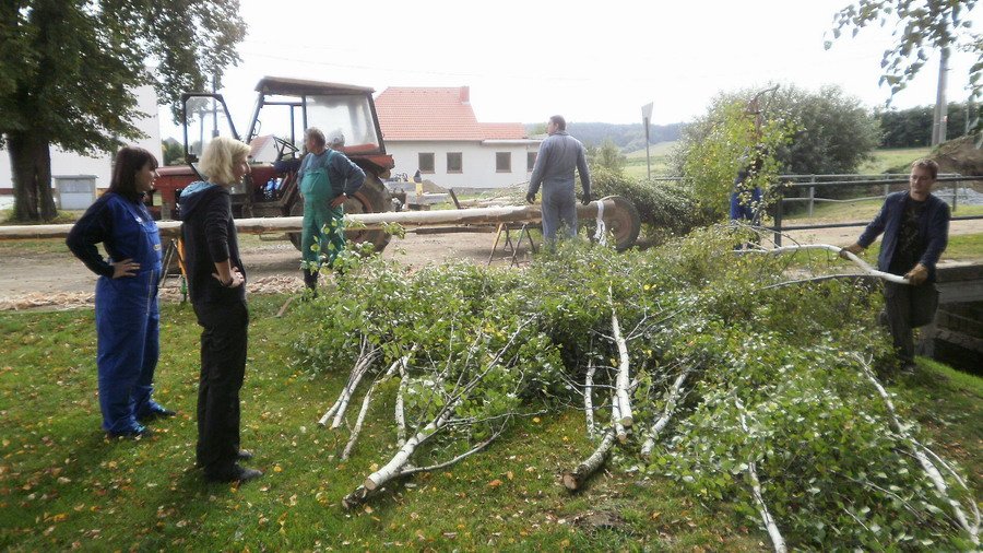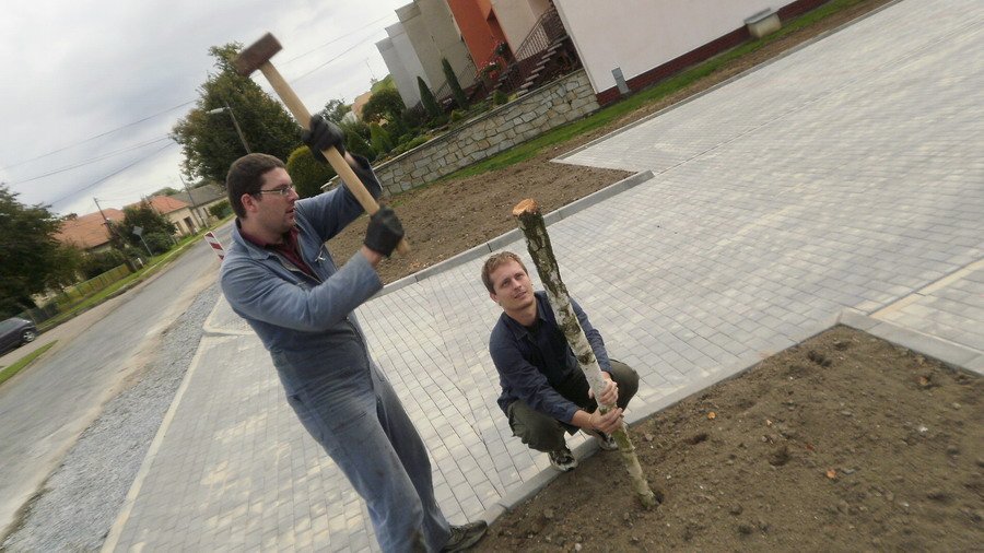 Zatlučení kůlů, ke kterým se připevnily májky u parkoviště: