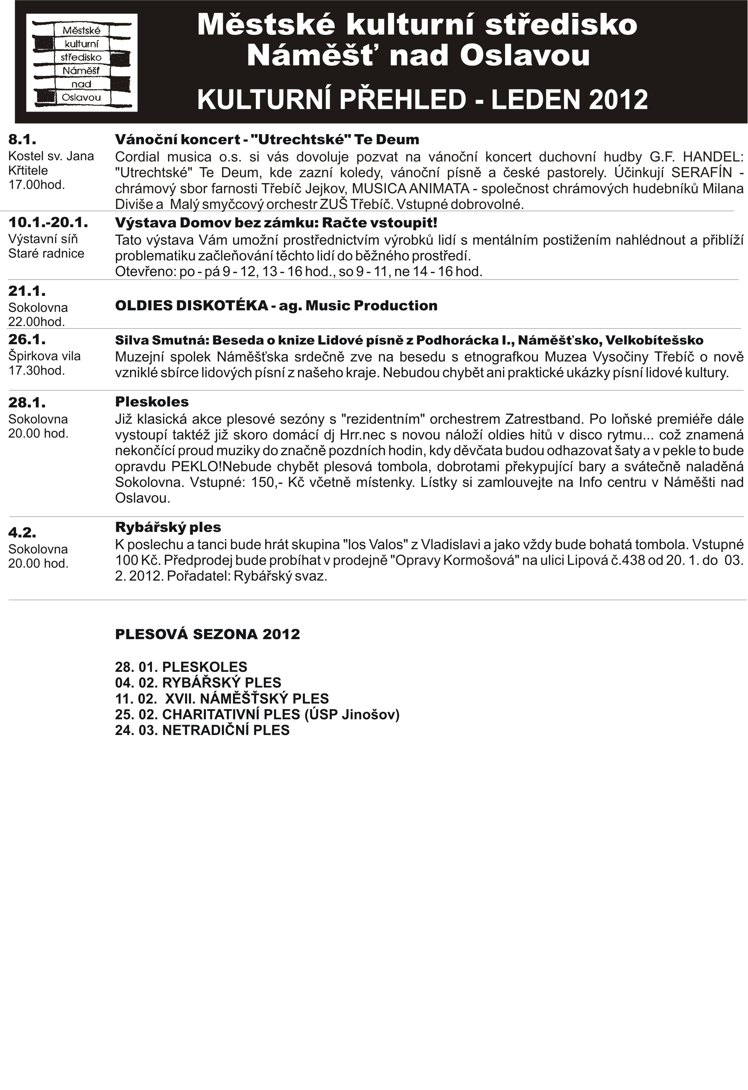 Kulturní přehled akcí IC Náměšť nad Oslavou na měsíc leden 2012.