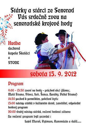 V sobotu 15. září 2012 se budou v Senoradech konat již tradičně krojované hody. K tanci a poslechu zahraje dechová kapela Skaláci a kapela Stone.