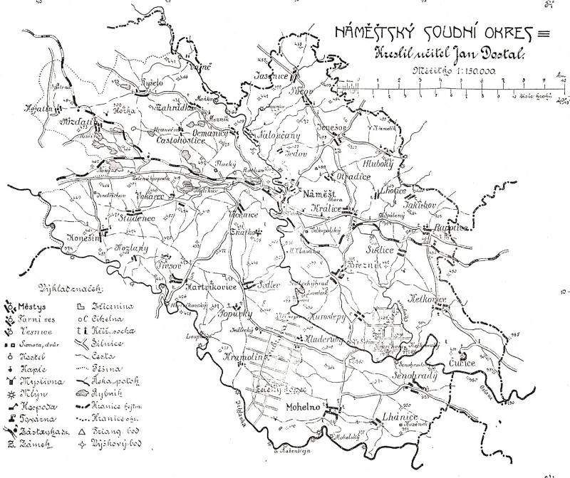 Mapa "Náměštského soudního okresu" nakreslená učitelem Janem Dostalem v měřítku 1:150000. Mapa byla otištěna v příloze "Vlastivědy Moravské".