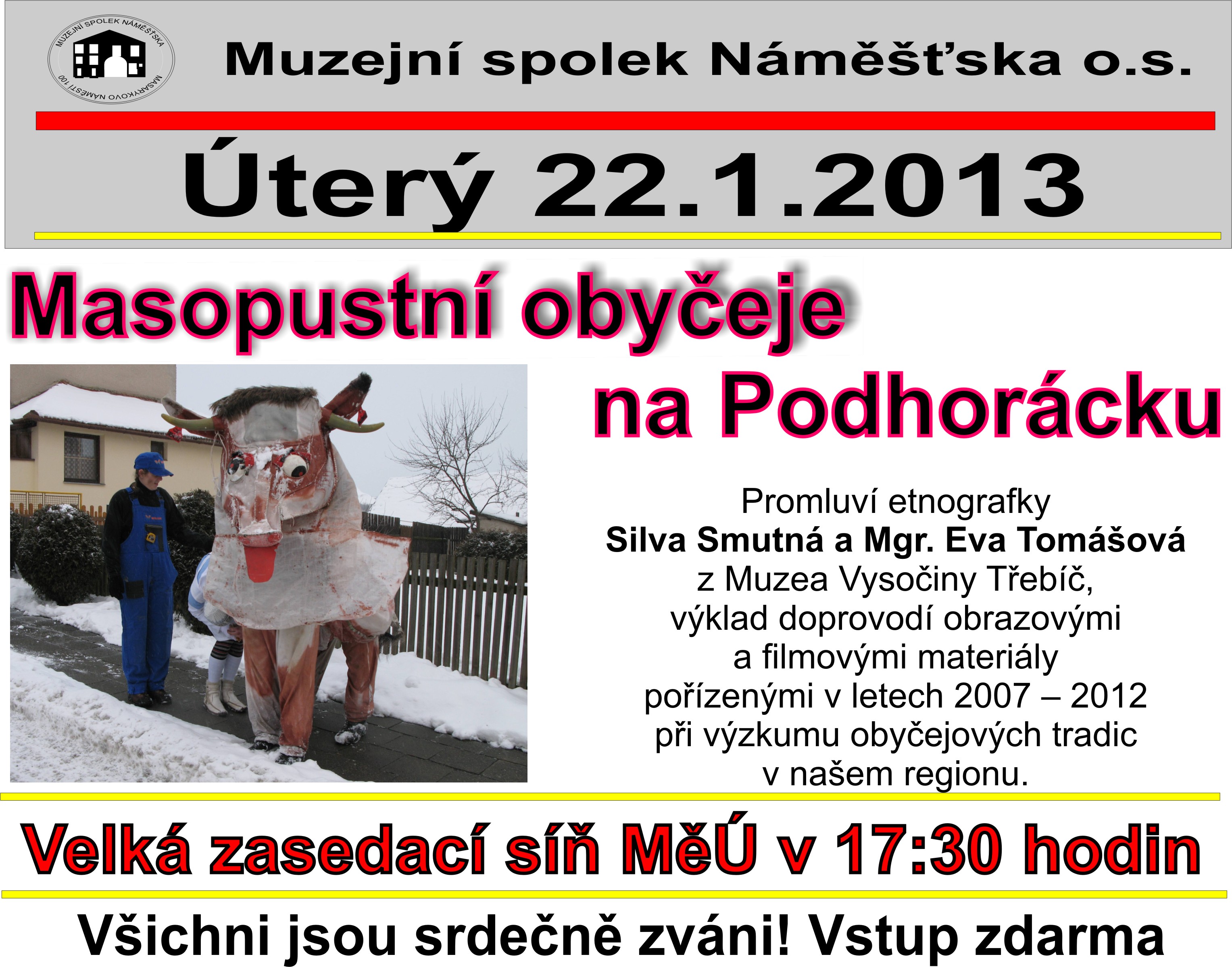 Pozvánka na besedu se Silvou Smutnou a Mgr. Evou Tomášovou, které promluví o masopustních obyčejích na Podhorácku. Výklad doprovodí obrazovými a filmovými materiály pořízenými v letech 2007 - 2012 při výzkumu obyčejových tradic v našem regionu. Začátek přednášky je v 17:30 ve velké zasedací místnosti MěÚ Náměšť nad Oslavou. Přednáška se koná 22.1.1013. Vstup zdarma.