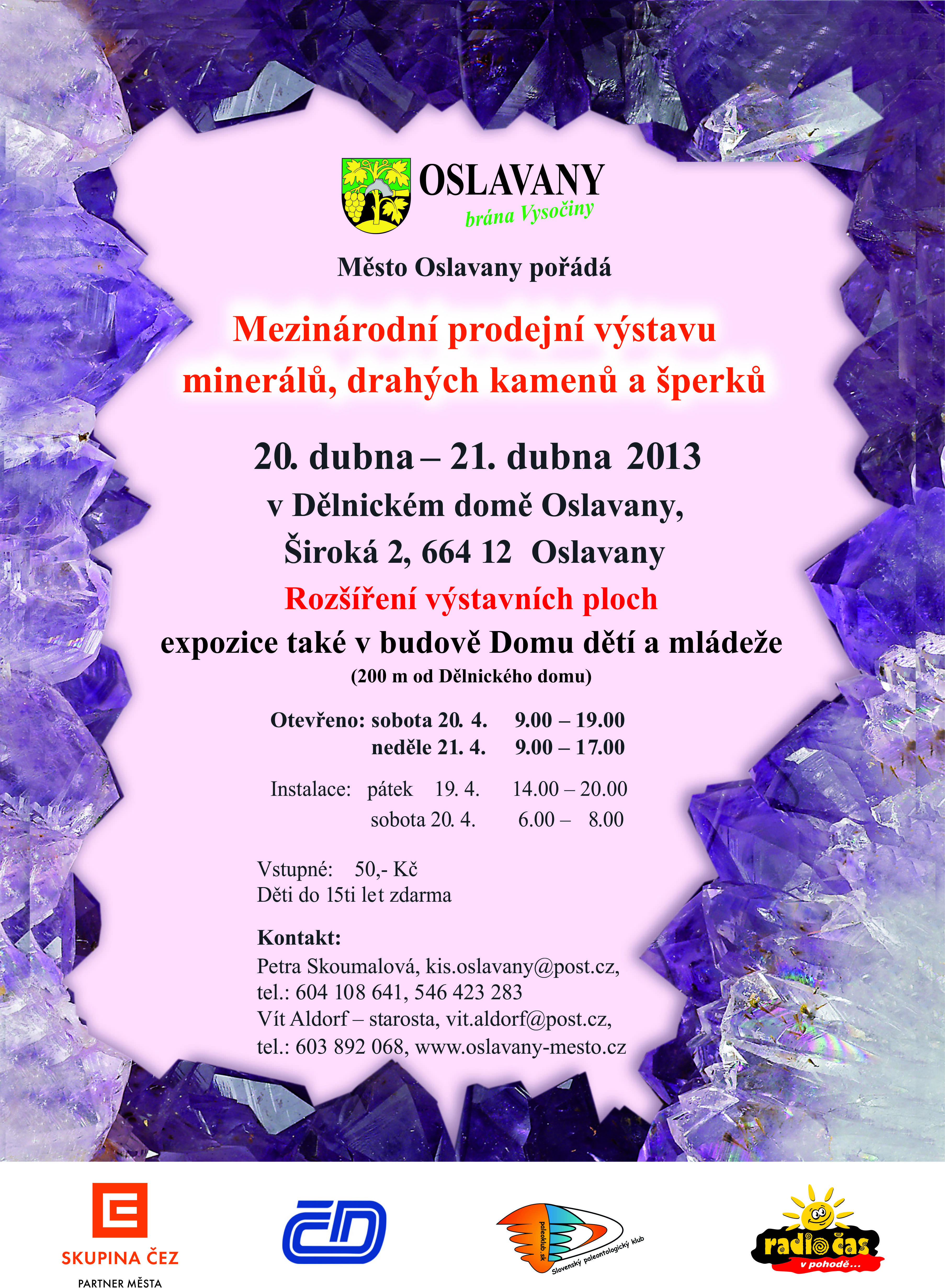Město Oslavany v měsíci dubnu pořádá již tradiční Prodejní výstavu minerálů, drahých kamenů a šperků v Oslavanech.
