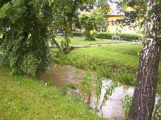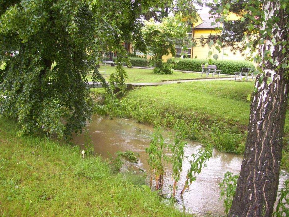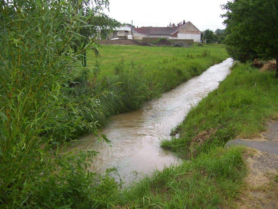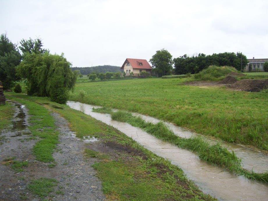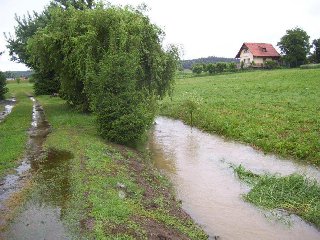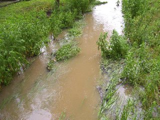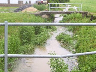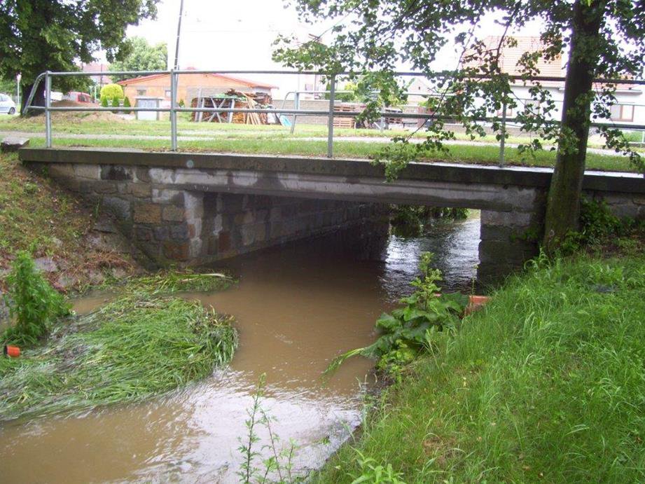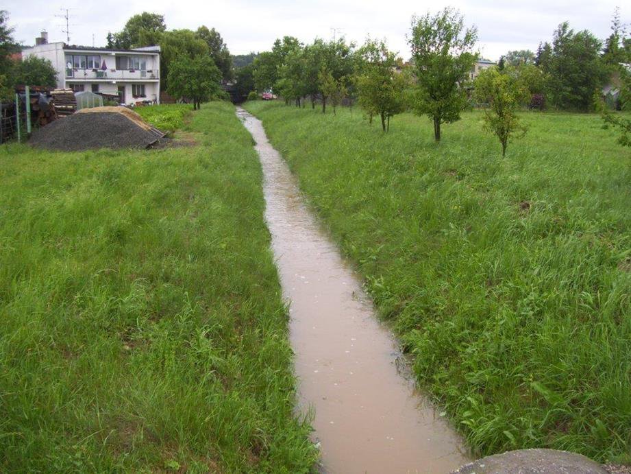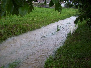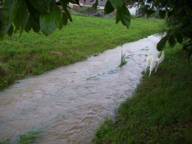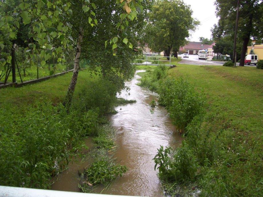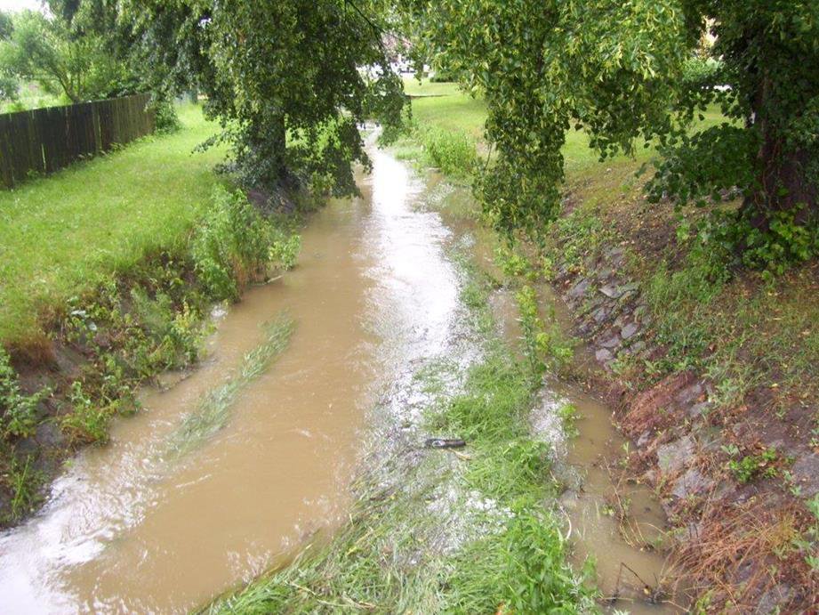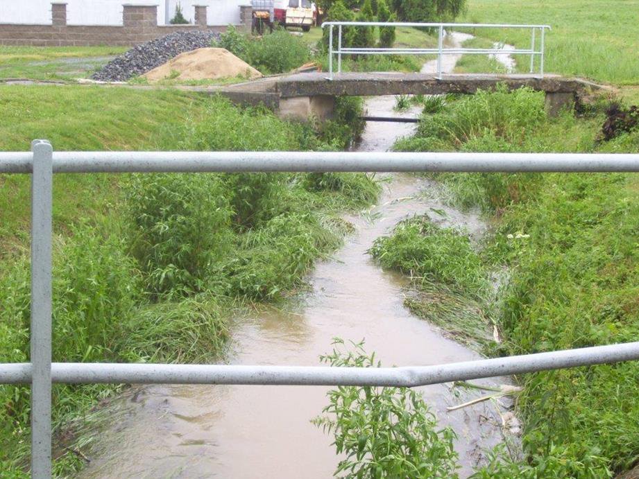 Deště z června 2013 zasáhly také naši obec. V úterý 25.6.2013 ráno zaplnila voda celé koryto potoka: