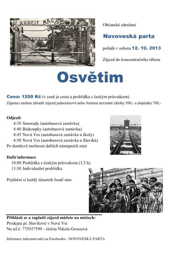 Občanské sdružení Novoveská parta pořádá na sobotu 12.10.2013 zájezd do koncentračního tábora Osvětim.