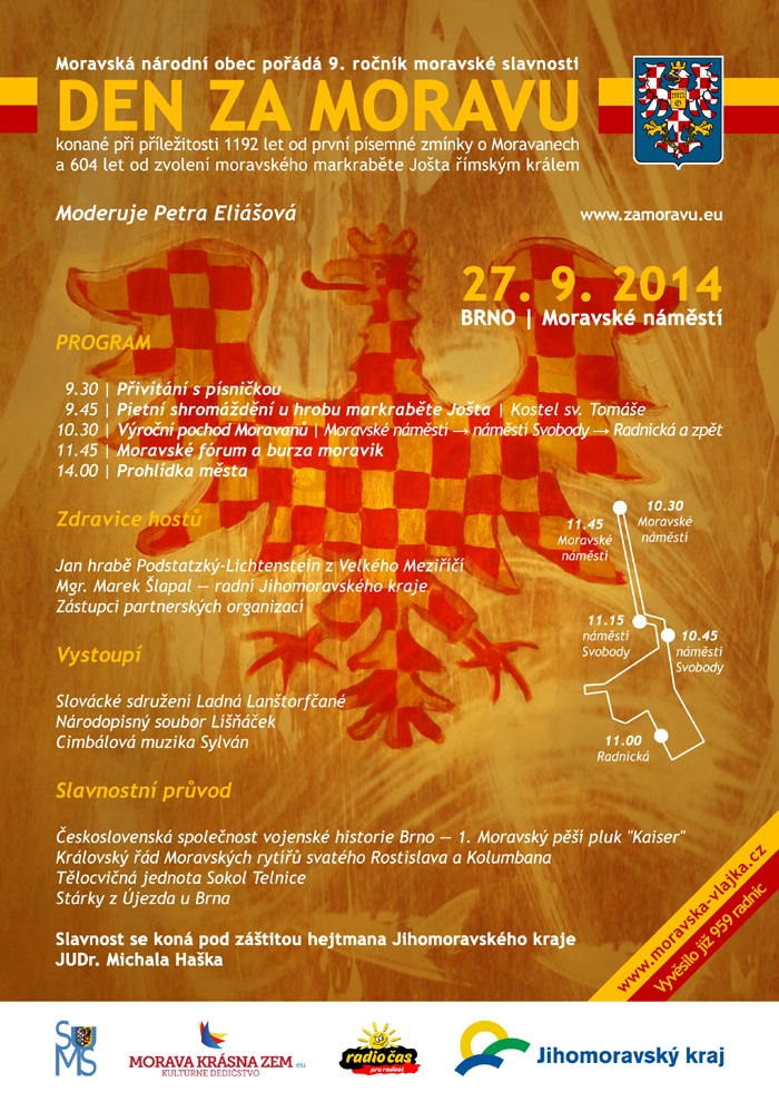 Pozvánka na tradiční moravské slavnosti Den za Moravu, která se koná v Brně dne 27. září 2014 pod záštitou hejtmana Jihomoravského kraje pana JUDr. Michala Haška.