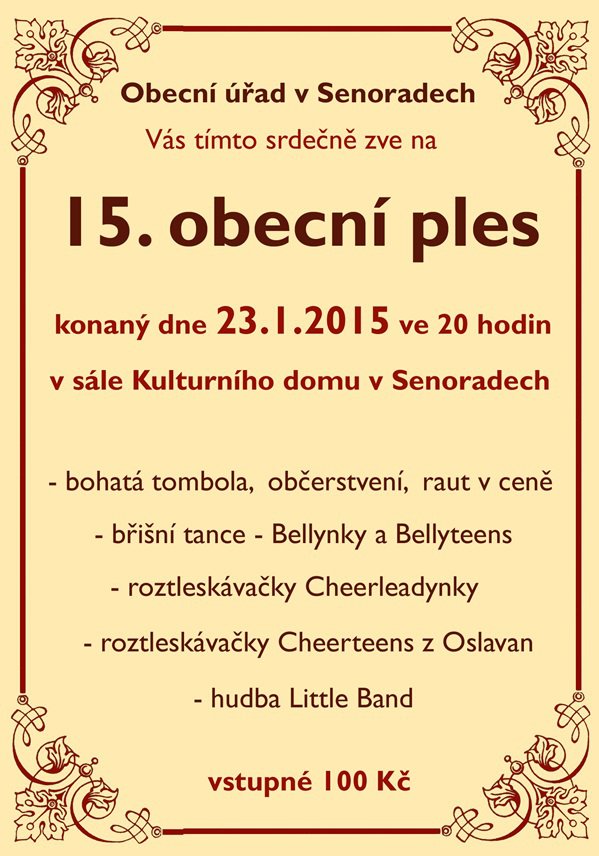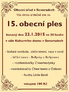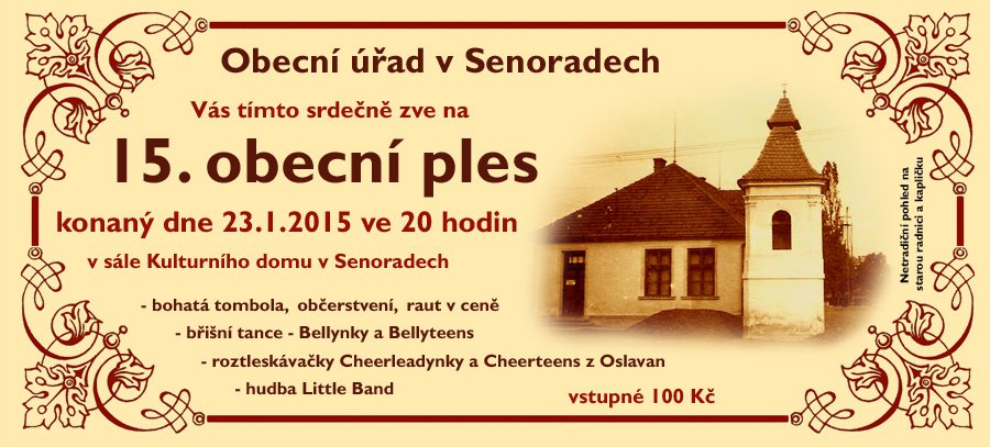 Obec Senorady vás tímto srdečně zve na 15. obecní ples konaný dne 23.1.2015 v sále kulturního domu Senorady.