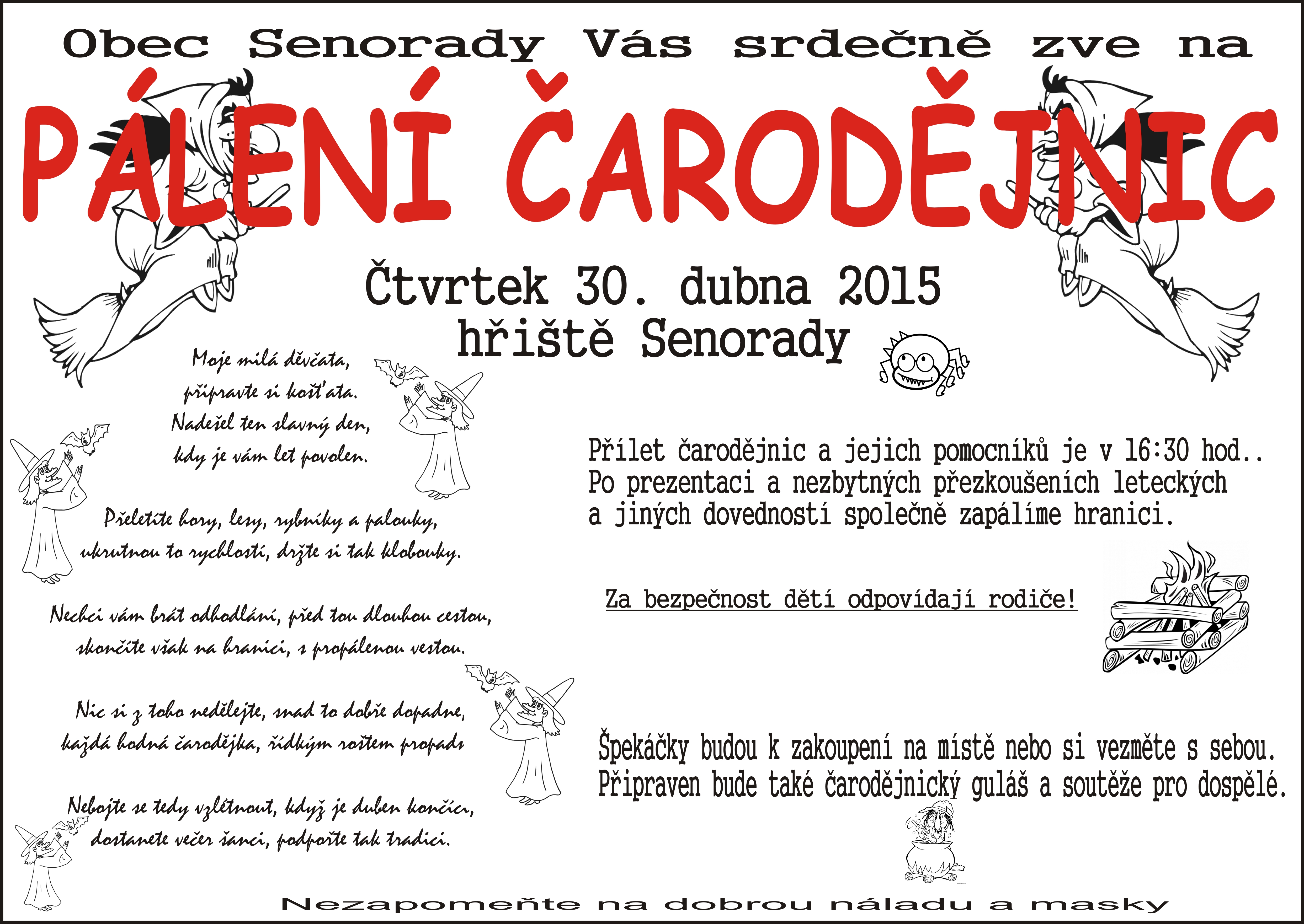 Srdečně zveme rodiče a děti na "Pálení čarodejnic" které se uskuteční 30. dubna od 16:30 na hřišti v Senoradech.