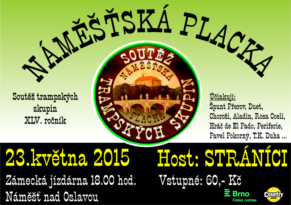 Soutěž amatérských trampských skupin Náměšťská placka, která se koná v sobotu 23. 5. 2015 v Náměšti nad Oslavou. Vstupenky v hodnotě 60,- Kč lze zakoupit v IC v Náměšti nad Oslavou.