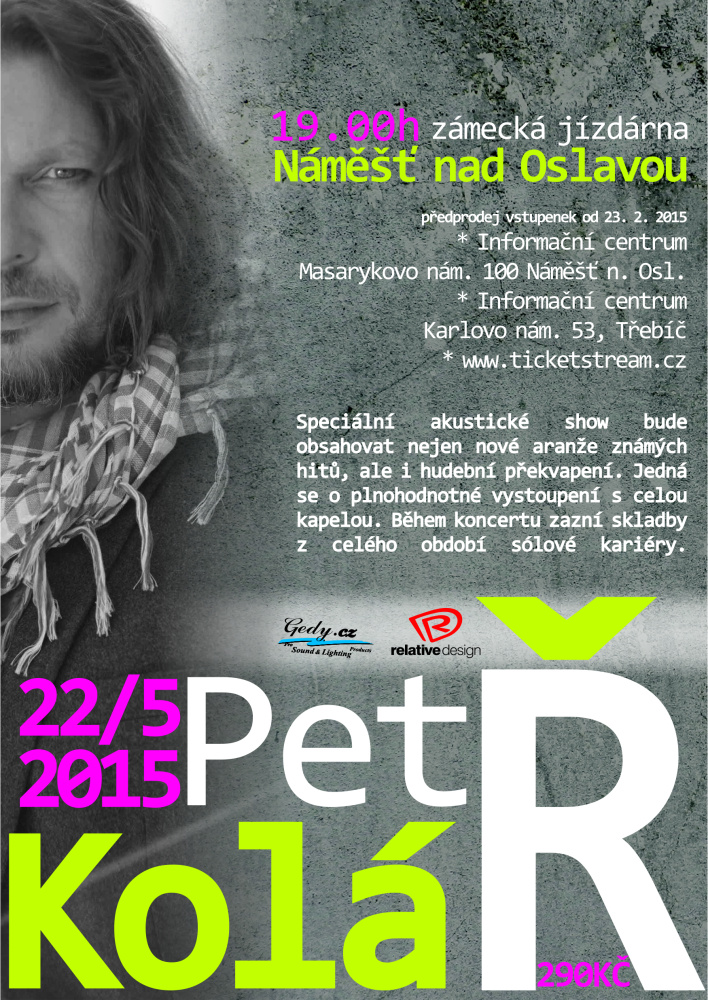 Koncert Petra Koláře, který se uskuteční v pátek 22. 5. 2015 v Náměšti nad Oslavou. Vstupenky jsou za 290,- Kč a lze je koupit v Informačním centru v Náměšti n. O., v Informačním centru v Třebíči nebo na www.ticketstream.cz