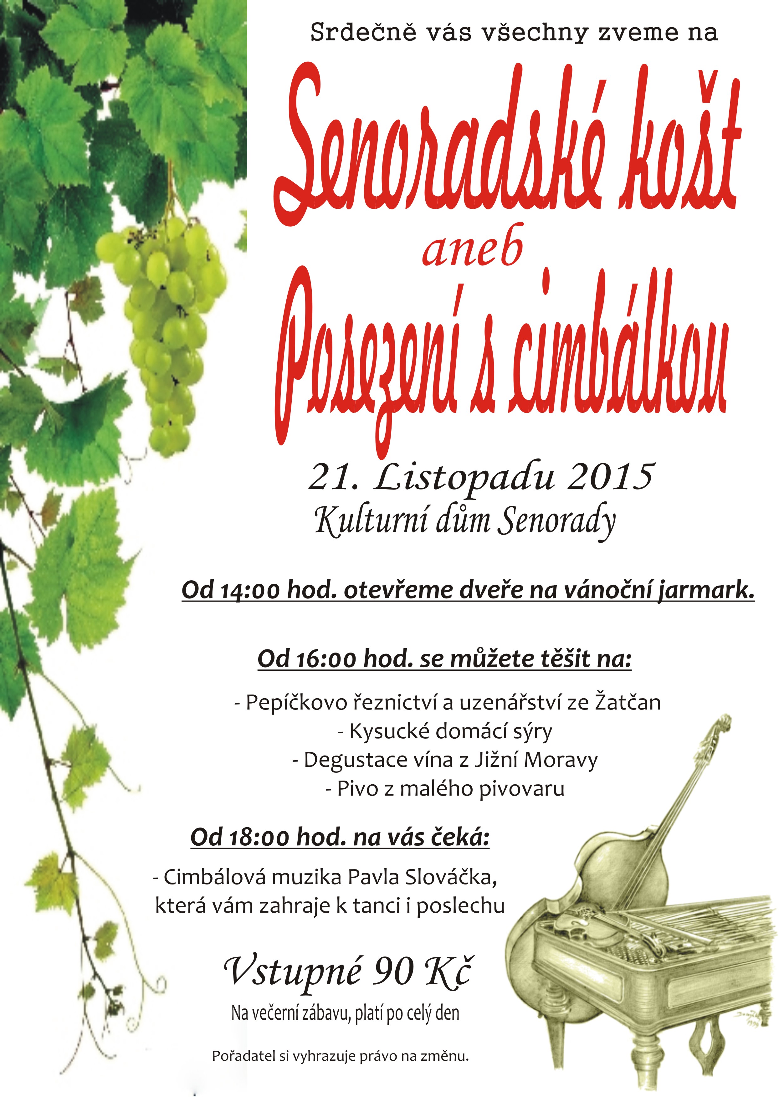 Srdečně vás všechny zveme na Senoradské košt aneb posezení s cimbálkou - 21.listopadu 2015 v kulturním domě Senorady.
