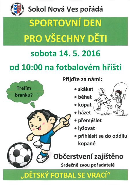 Sportovní den pro všechny děti, sobota 14.5.2016, od 10. hod na fotbalovém hřišti Nová Ves.