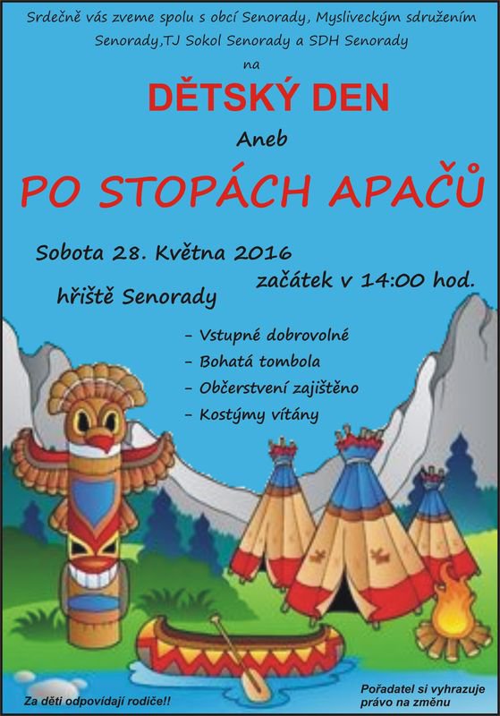 Srdečně vás zveme na DĚTSKÝ DEN aneb PO STOPÁCH APAČŮ, který se uskuteční 28.května 2016, začátek od 14:00 hod hřiště Senorady.