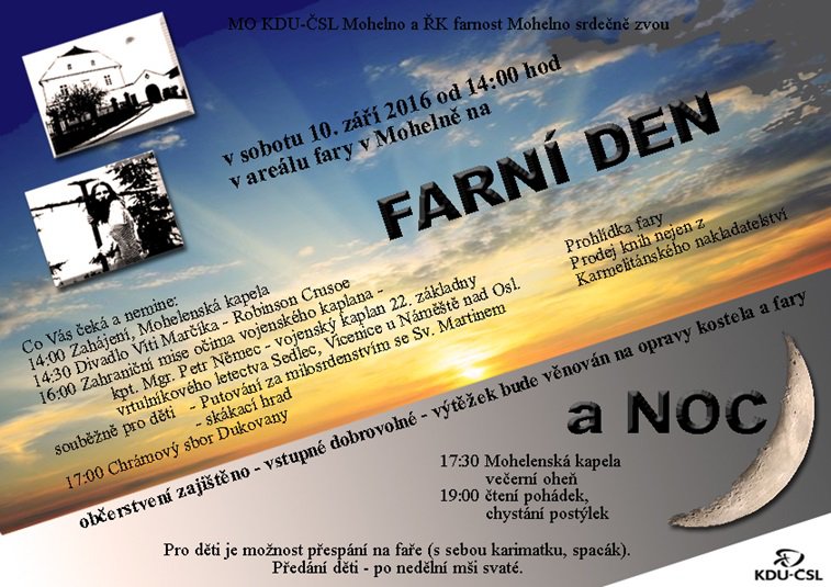 Pozvánka na farní den 2016, který se uskuteční v sobotu 10. září 2016 na farním dvoře Mohelno.