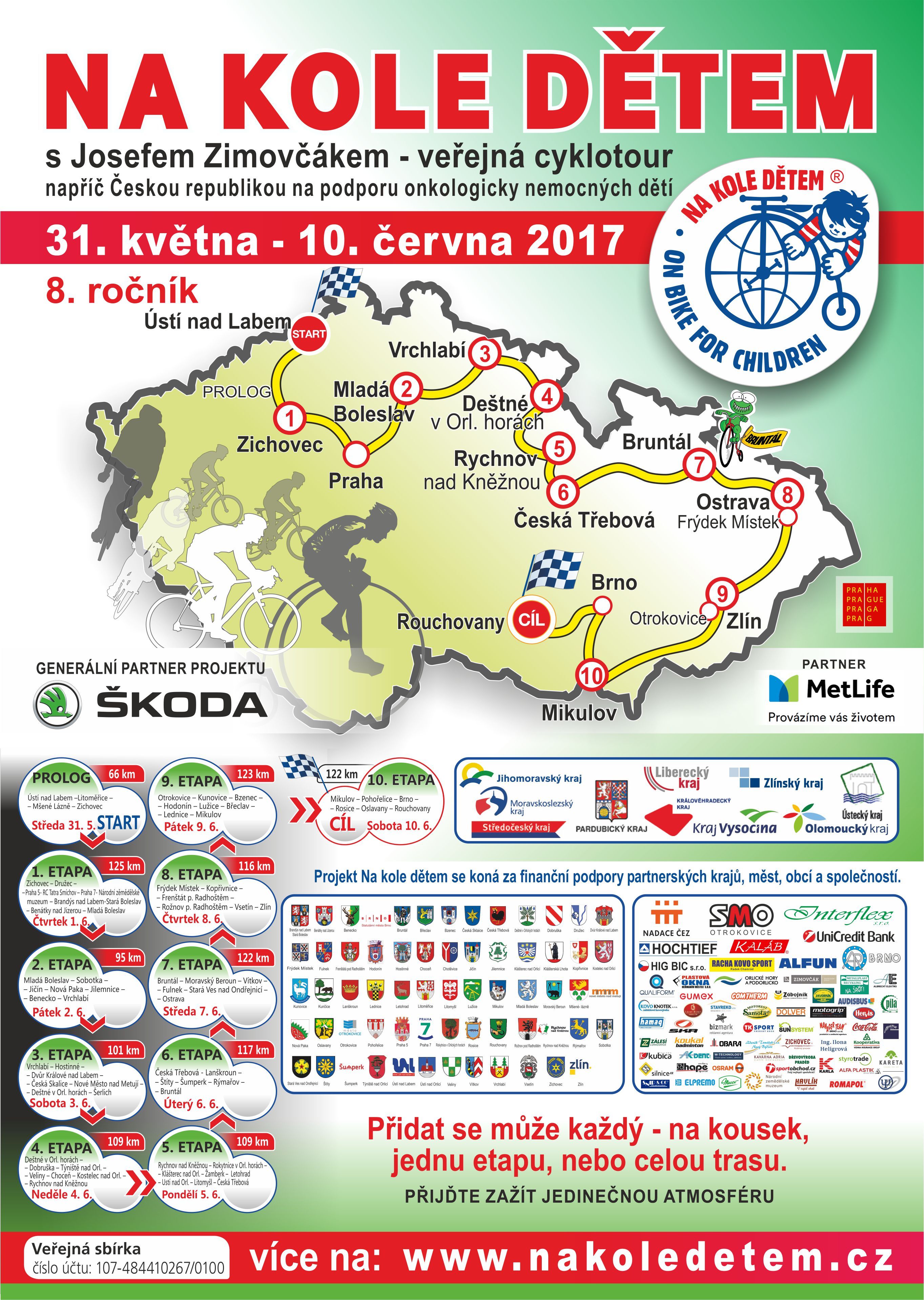 Projekt Na kole dětem si klade za cíl pomáhat dětem,které prodělaly léčbu rakoviny.Zakladatelem celého projektu je Josef Zimovčák,10 ti násobný mistr světa v jízdě na vysokém kole.Letos bude probíhat již 8.ročník této akce a pojede se celou republikou z Ústí nad Labem do Rouchovan, a to ve dnech 31.5.-10.6.2017. K peletonu se může přidat úplně každý, a to na celou trasu nebo jen na několik kilometrů nebo metrů.Během přestávky v zastávkových městech probíhá program, kde se mohou děti svézt i na vysokém kole.Ti co nemají možnost se přidat na kole, tak mohou přijít fandit na trasu nebo na náměstí.Trasu cyklotour i další informace najdete na stránkách www.nakoledetem.cz, které jsou průběžně aktualizovány a kde bude v době konání cyklotour k dispozici i mapa se znázorněním aktuálního pohybu peletonu na trase. Zúčastněte se i Vy, buď přímo v peletonu nebo jako fanoušci u trati.