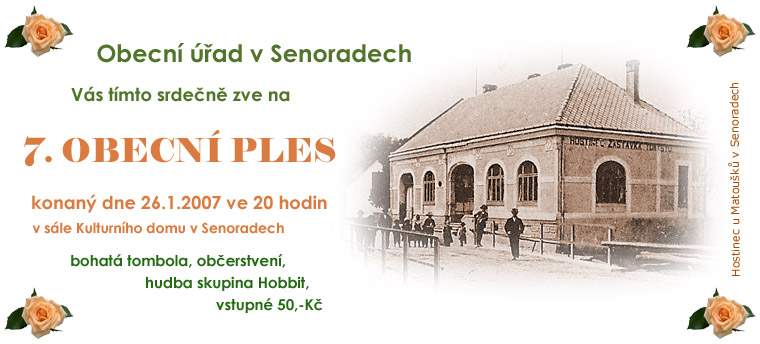 Zveme tímto všechny občany na 7.obecní ples, který se bude konat dne 26.1.2007 ve 20 hodin v kulturním domě Senorady.