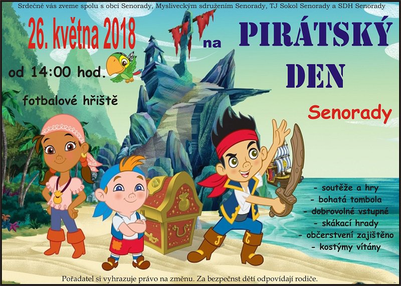 Srdečně vás zveme spolu s obcí Senorady, Mysliveckým sdružením Senorady, TJ Sokol Senorady a SDH Senorady na PIRÁTSKÝ DEN V SENORADECH, který se bude konat 26.5.2018 od 14:00 hod na fotbalovém hřišti Senorady.