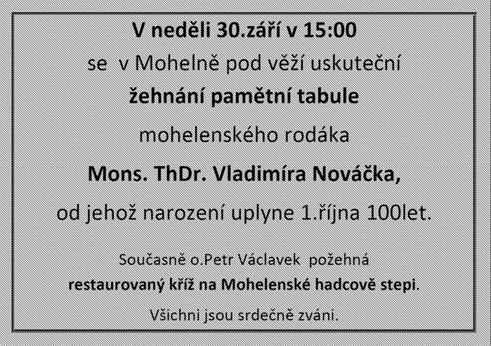 Odhalení pamětní tabule Mons. ThDr. Vladimíra Nováčka v neděli 30. září 2018 v 15 hodin v Mohelně pod věží.