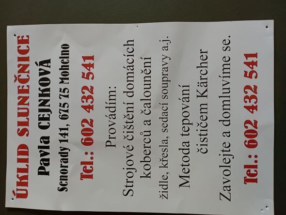 V přiloženém letáku naleznete nabídku na poskytování služeb: strojové čištění domácích koberců a čalounění, tepování. zájemci mohou volat na tel: 602 432 541, p. Cejnková