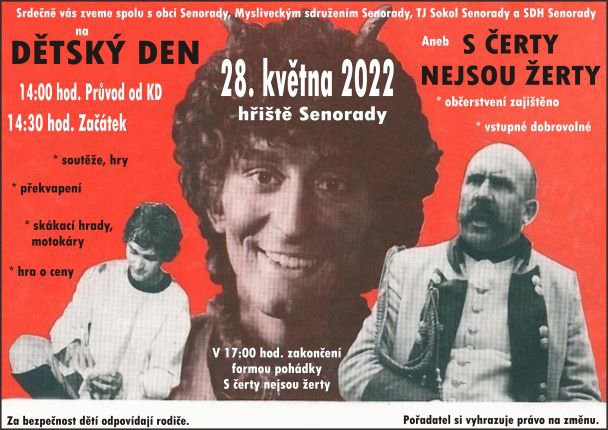 Obec Senorady ve spolupráci s místními spolky a dobrovolníky srdečně zve všechny děti, rodiče a prarodiče na Dětský den, který se bude konat 28.5.2022 od 14:30 hodin v areálu hřiště v Senoradech. Pro děti budou připraveny soutěžní úkoly, zábava i odměny. Bohaté občerstvení zajištěno.