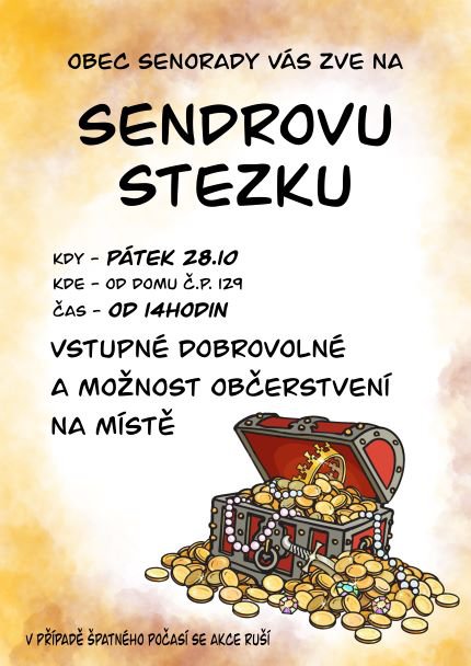 Srdečně zveme všechny děti, rodiče i prarodiče na podzimní akci "Sendrova stezka", která se uskuteční v pátek 28.10.2022 od 14:00 hodin. Stezka plná her a úkolů povede od domu č.p. 129 směrem k "cihelně", kde bude možnost drobného občerstvení.