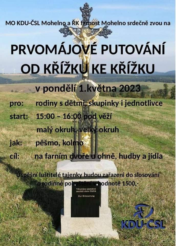 1.května se vydáme je poznat blíže. Průběžný start účastníků (rodin s dětmi i jednotlivců) bude na městečku pod věží. Cílem putování bude podle mapky kříže obejít a podle zadaných indicií rozluštit tajenku spojenou s nápisy na nich.