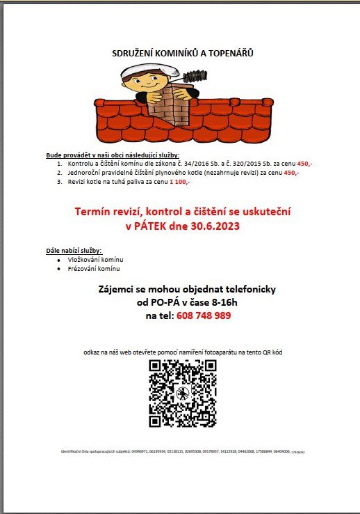 Bude provádět v naší obci v PÁTEK dne 30.6. požadované kontroly a čištění