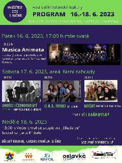 V pátek zahajujeme Mší svatou a koncertem klasické hudby, sobotní odpoledne patří folkovým skupinám a besedám a v neděli zakončíme večerními modlitbami chval.