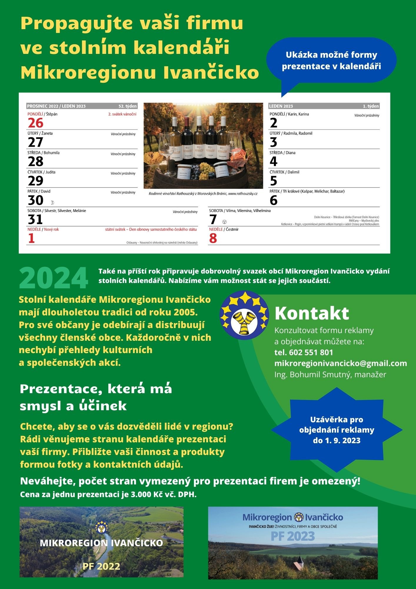 v součinnosti s Mikroregionem Ivančicko Vám nabízíme možnost zveřejnění a propagace vaší reklamy ve stolních kalendářích Mikroregionu Ivančicko v příštím roce.