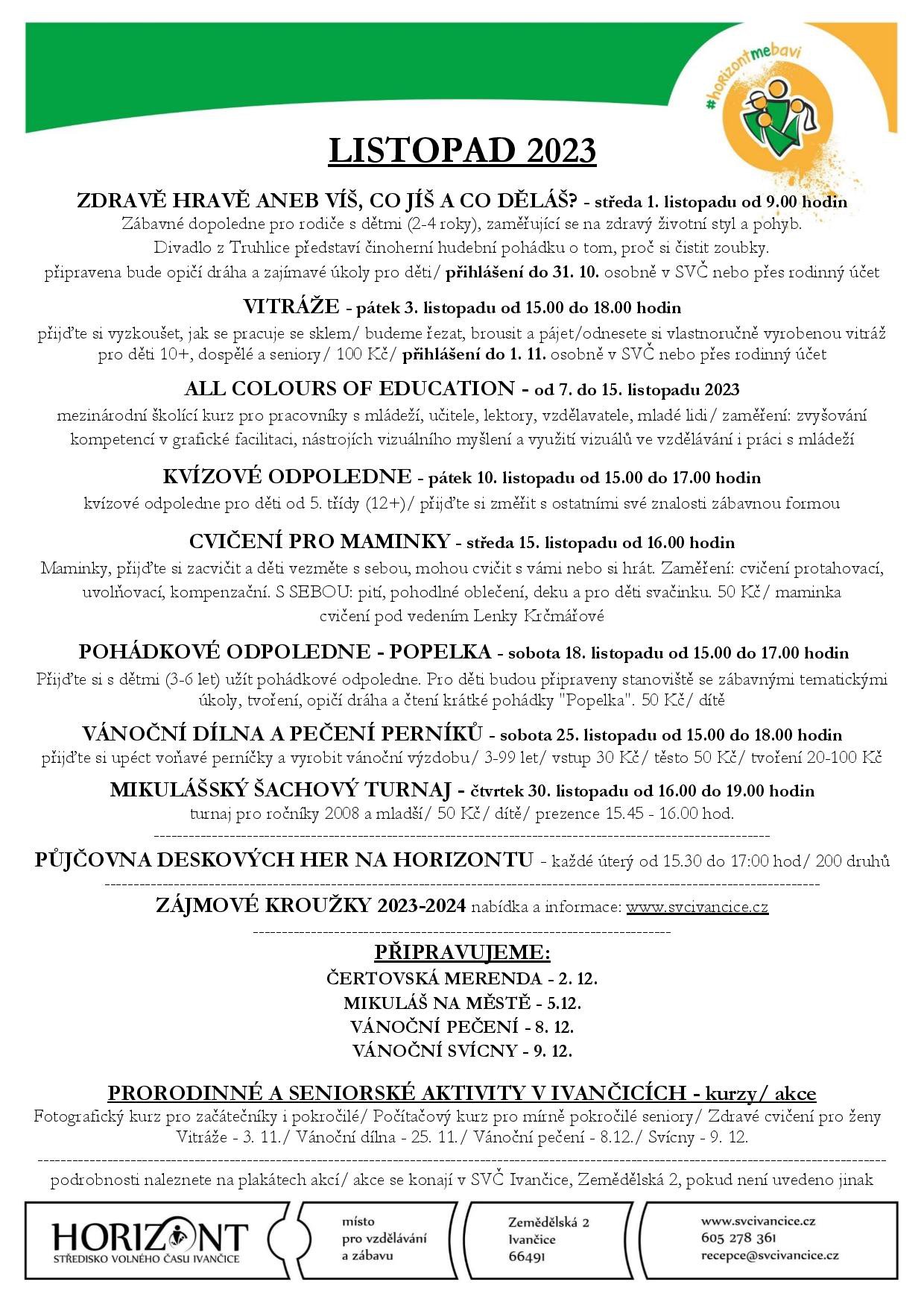 V příloze zveřejňujeme seznam akcí, které pořádá SVČ Ivančice v měsíci listopadu.