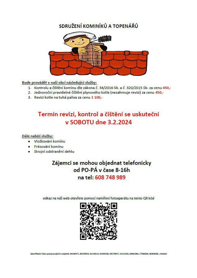 Bude provádět v naší obci v SOBOTU dne 3.2. požadované kontroly a čištění komínů dle zákona č. 34/2016 Sb. za 450 Kč, čištění plynových kotlů za 450 Kč a revize kotlů na tuhá paliva za 1 100 Kč. Dále nabízí vložkování a frézování komínů.