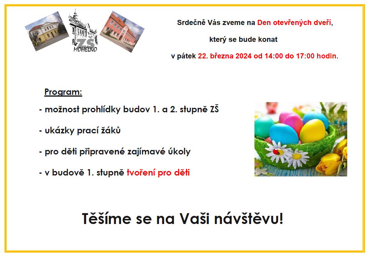 Základní škola Mohelno pořádá v pátek 22.března od 14.00 do 17.00 hodin Den otevřených dveří na obou budovách školy. Pro děti jsou připraveny zajímavé úkoly a velikonoční tvoření. Všichni jsou srdečně zváni!!