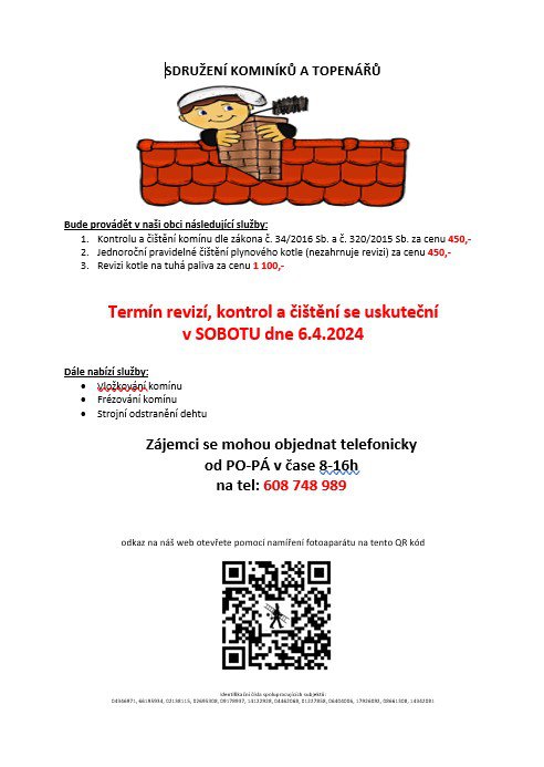 Bude provádět v naší obci v SOBOTU dne 6.4. požadované kontroly a čištění