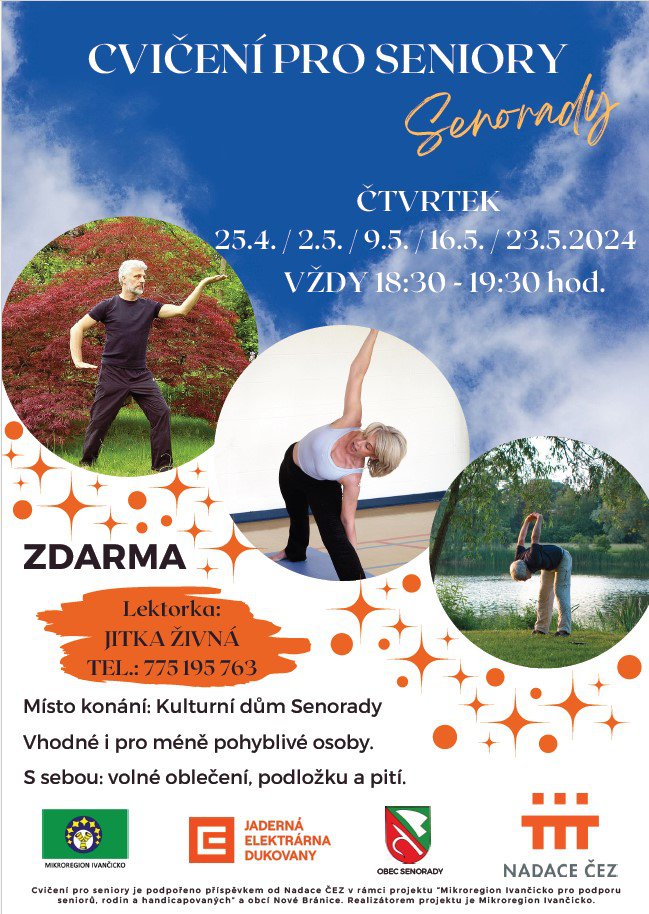 Srdečně zveme občany z řad seniorů na lekce cvičení pro seniory, které se uskuteční v termínech 25.4, 2.5.a 9.5.2024 vždy od 18:30-19:30 hodin v sále kulturního domu. Podrobnosti v přiloženém plakátu.