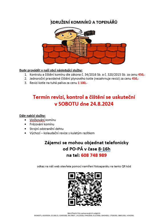 Bude provádět v naší obci v SOBOTU dne 24.8. požadované kontroly a čištění