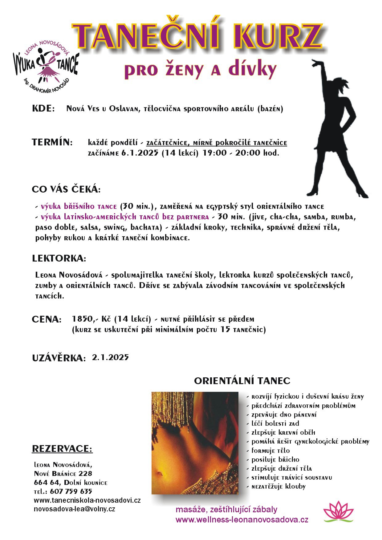 Paní Leona Novosádová srdečně zve ženy a dívky na pokračování tanečního kurzu v Nové Vsi, začátek 6.1.2025, uzávěrka přihlášení je 2.1.2025.