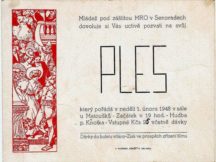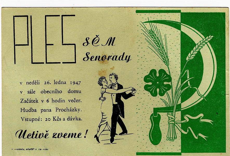 Pozvánky na plesy konané mládeží v obci Senorady. Plesy mládež pořádala pod hlavičkou Československého svazu mládeže.