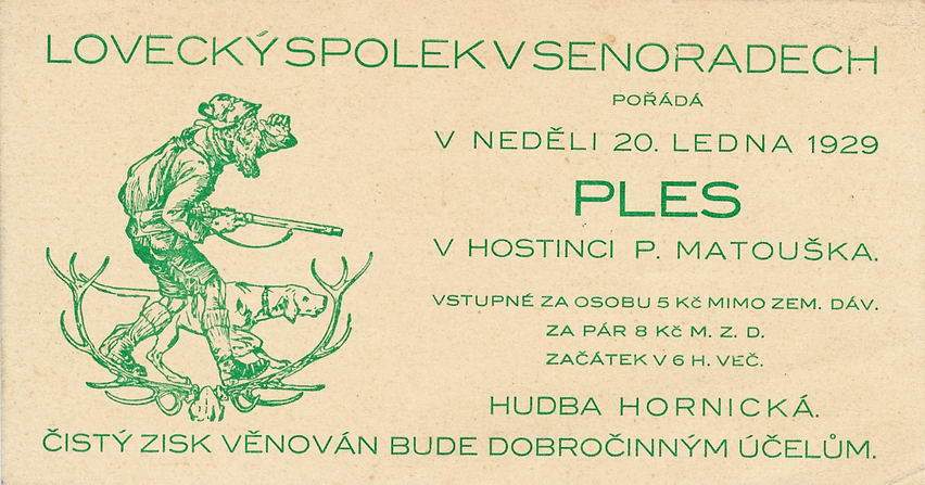 Pozvánky na myslivecké plesy konané v obci Senorady. Myslivci tradičně pořádají také poslední leč. Plesy se konaly buď ve staré hospodě nebo v hospodě pana Matouška. Později, když byl postaven kulturní dům, se začaly plesy konat tam.