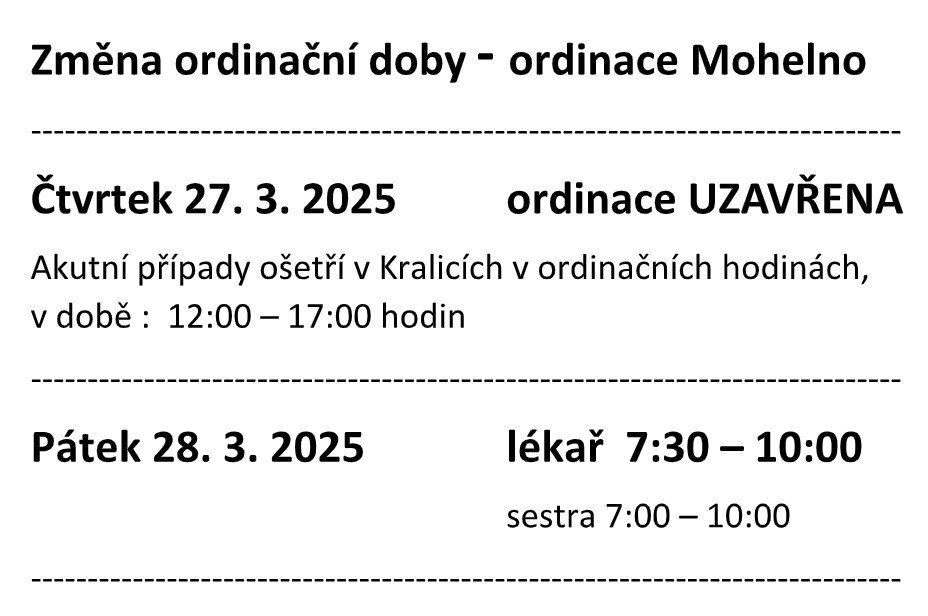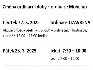 Ordinace Dr. Jedličky oznamuje, že ve čtvrtek 27.března nebude ordinovat, v pátek 28. března bude lékař přítomen od 7:30 - 10:00 hodin. Akutní případy ošetří v Kralicích.
