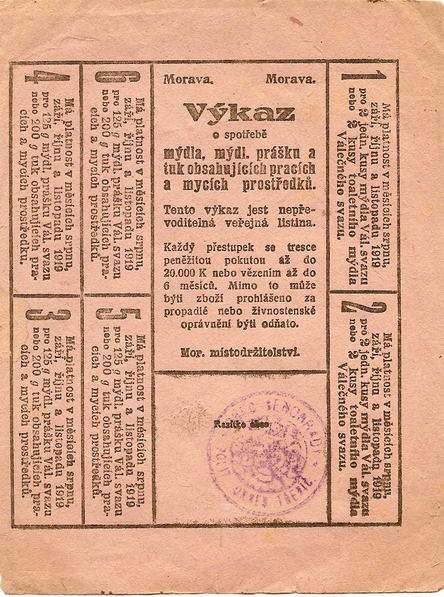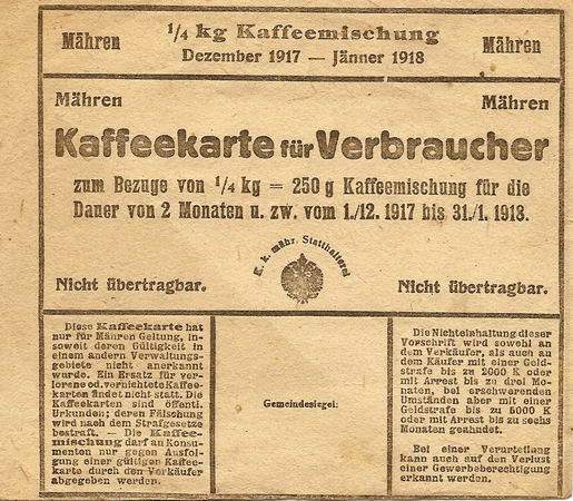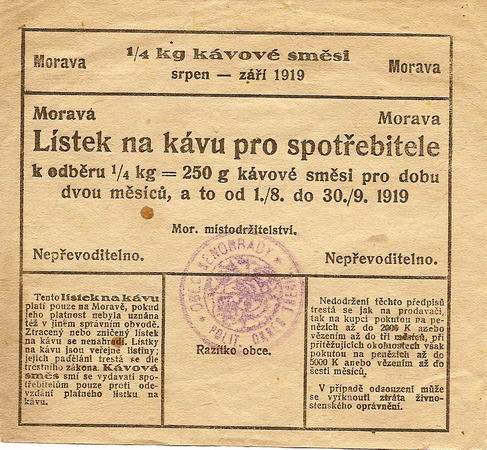 První lístky jsou z posledních let první světové války a jejich vlastník si za ně mohl koupit kávu. Další lístek je z roku 1919, tedy prvního svobodného roku po první světové válce, a byl opět určený na kávu. Další lístek z roku 1919 sloužil k nákupu mycích prostředků (mýdlo a mýdlový prášek). Následují lístky na oděv z dob druhé světové války a lístek na cukr, vejce a jiné potraviny z doby po druhé světové válce.