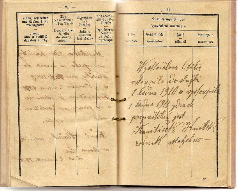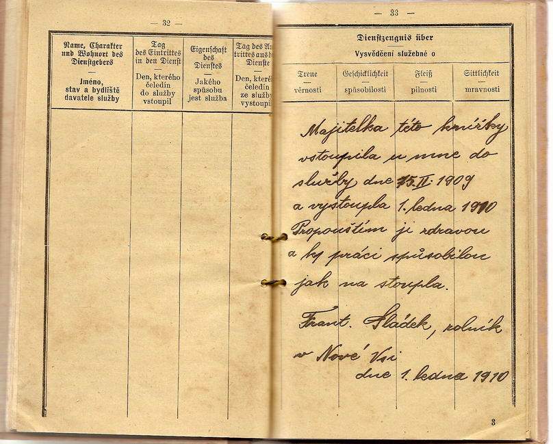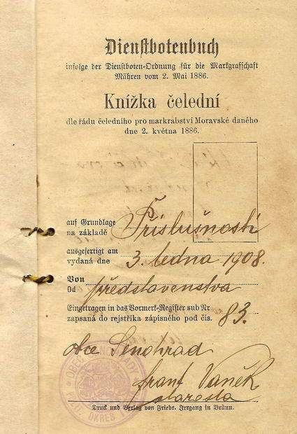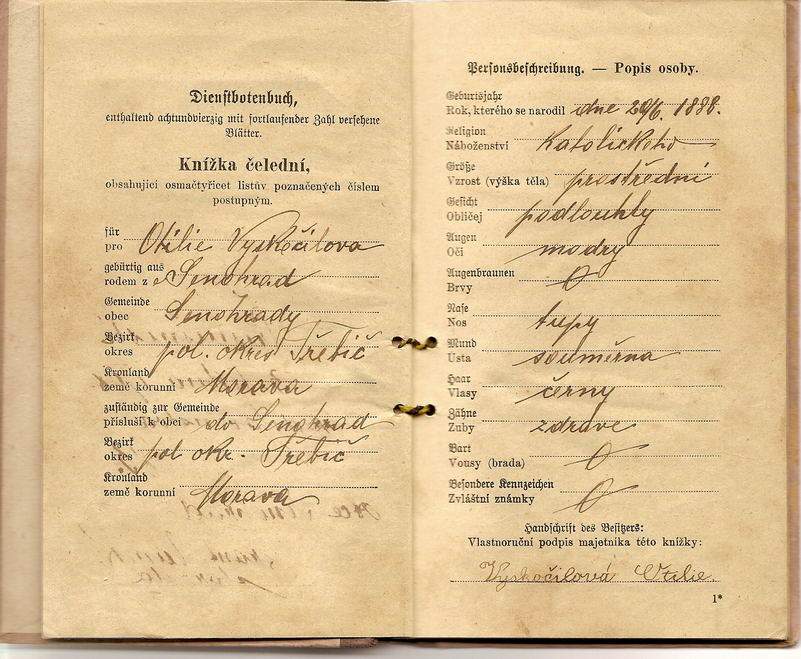 První knížkou je Knížka čelední Otilie Vyskočilové narozené 20. června 1888, která byla vydána 3.ledna 1908 senoradským starostou Františkem Vaňkem. Knížka obsahuje posudky sedláků, u kterých čeledníce pracovala, a popis samotné držitelky této knížky. Popis nám prozrazuje, že Otilie Vyskočilová byla katolického náboženství, vzrůstu prostředního, obličeje podlouhlého, oči modré, brvy žádné, nos tupý, ústa souměrná, vlasy černý, zuby zdravé, vousy a zvláštní známky žádné.