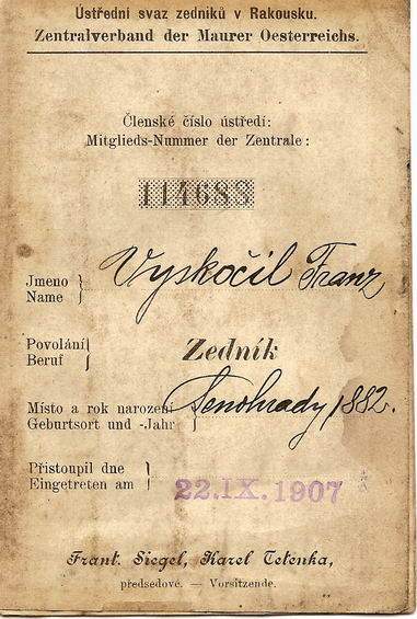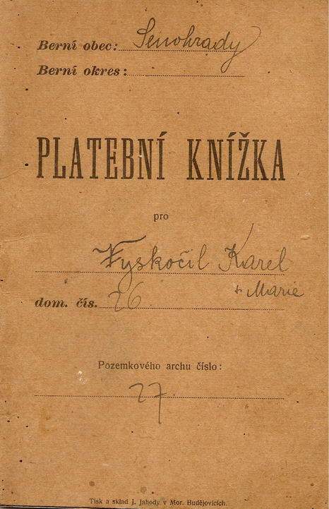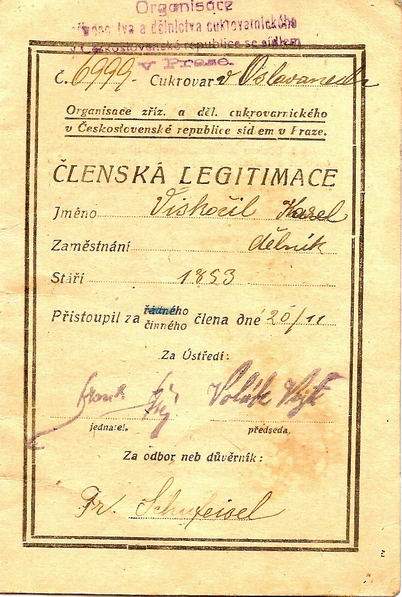 Dále si můžete prohlédnout legitimaci cukrovarskou, zednickou, odborovou a také platební knížku Karla a Marie Vyskočilových.